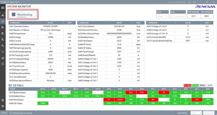 在对软件进行合理地设置后,就可以对板卡进行评估了,在这里我们以SYSTEM MONITOR功能为例进行说明。在保证板卡启动的基础上,点击软件上的”Monitoring”按钮,软件开始与板卡通信,我们可以看到界面上的各个寄存器的值都在根据板卡的状态实时变化,寄存器的地址后面有对其具体用途的解释,方便用户们快速了解当前的状态。而其他功能用法类似,工程师们可以自行尝试,另外R01AN7620EJ0101(R-BMS_F_Tool_UsersManual)文档中包含了每个选项的具体意义,在此就不一一列举。