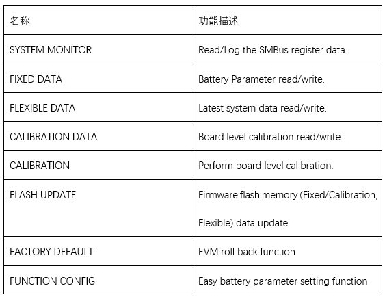 可以看到,整个界面简洁大方,界面的左边主要是板卡的外观图片,界面右边是整个软件具有的功能。包括SYSTEM MONITOR、FIXED DATA、FLEXIBLE DATA、CALIBRATION DATA、CALIBRATION、FLASH UPDATE、FACTORY DEFAULT、FUNCTION CONFIG等8个模块,它们的功能如下表所示: