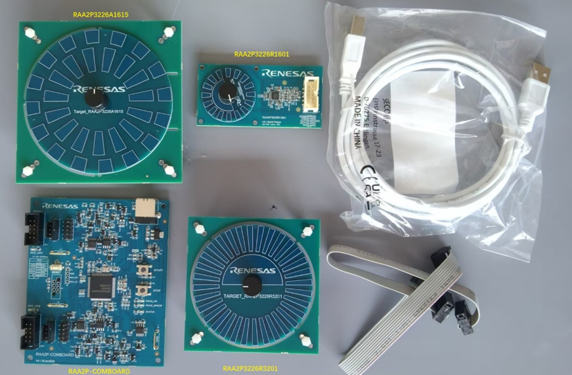 打开包装盒,里面包含了配套的USB电缆、2根用于连接位置传感器板卡的排线以及四块评估板,它们分别是RAA2P-COMBOARD通信板、RAA2P3226A1615板卡(高精度、18 位分辨率、89mm 半径绝对侧轴弧度编码器设计)、RAA2P3226R3201板卡(高精度、19 位分辨率、72mm 直径、绝对编码器设计)、RAA2P3226R1601板卡(高精度、18 位分辨率、34mm 直径、绝对编码器设计)。