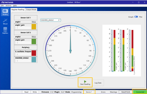 不论连接的是哪块子卡,点击“Start Reading”按钮开始读取数据,此时旋转对应子板上的旋钮,就可以看到指针以及柱状图会跟着发生变化。