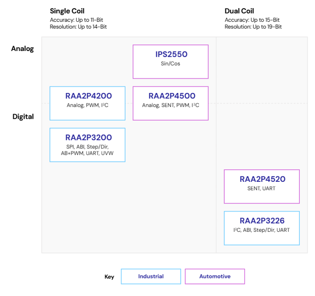 实际上,除了RAA2P3226芯片之外,瑞萨公司还提供其他采用相似技术的位置传感器供客户根据应用的实际情况进行选择(如下图所示),他们根据原理的不同可以分为单线圈及双线圈两种,对自动化及工业应用场合进行了分别优化。