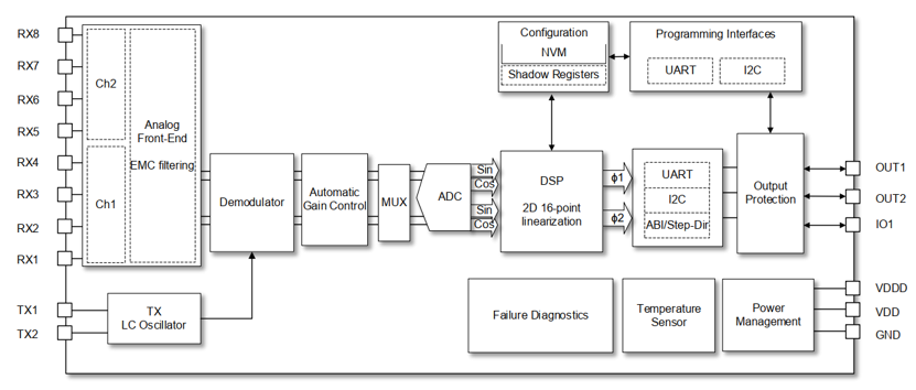 由于我们今天的主角是RAA2P3226芯片,因此我们首先来看看它的性能。它是瑞萨公司最新推出的一款高速无磁电感式位置传感器IC,可用于绝对和增量位置传感领域。其采用涡流物理原理,即通过检测金属目标在一组线圈(包括一个发射线圈和两组接收线圈)上方的位置来工作。通过简单的金属靶标及单线圈 / 双线圈配置,即可实现绝对旋转位置、线性位置或弧形位置的检测。这种产品设计可耐受恶劣环境条件,在粉尘、潮湿、机械振动及电磁干扰等场景下均能保持稳定运行。更重要的是,与基于磁编码器或光学编码器的传感器不同,该系列产品不受杂散磁场影响,且无需维护。