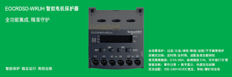 EOCRDSD-WRUH是施耐德电气推出的一款EOCR-DSD系列电子式电动机保护继电器的完整型号。它主要用于为低压电动机提供全面的保护与智能监测,是施耐德EOCR产品线的重要升级型号。中国区营销中心,中国区总代理:唐山韩雅电气设备有限公司