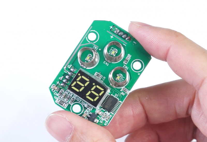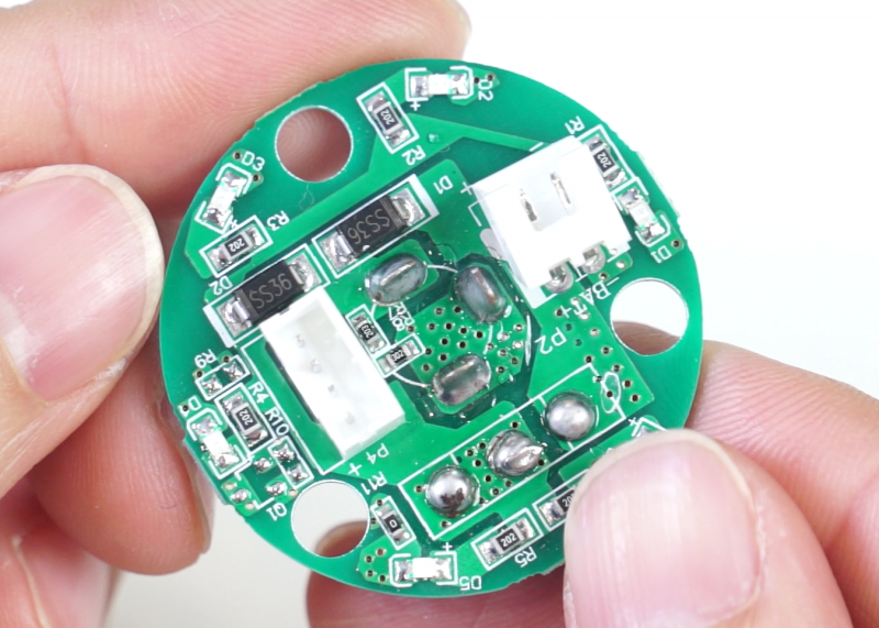 最后就是控制小板,也很简单。78L05的稳压器将电池电压降压输出5V电压给单片机供电,单片机为国产赛元的增强型8051内核(SC92F8362B),本身带有23通道的低功耗电容触摸电路,因此可以无缝实现筋膜枪上的3个触摸控制按键,此外这个单片机还集成6路独立的PWM信号,所以可以直接实现无刷电机的控制。